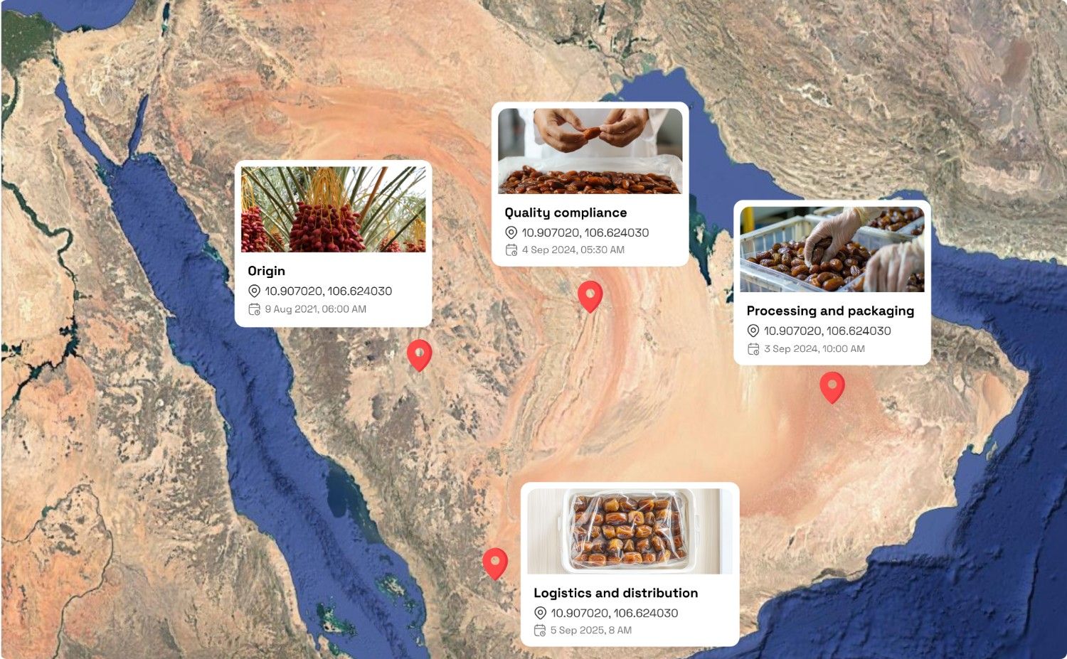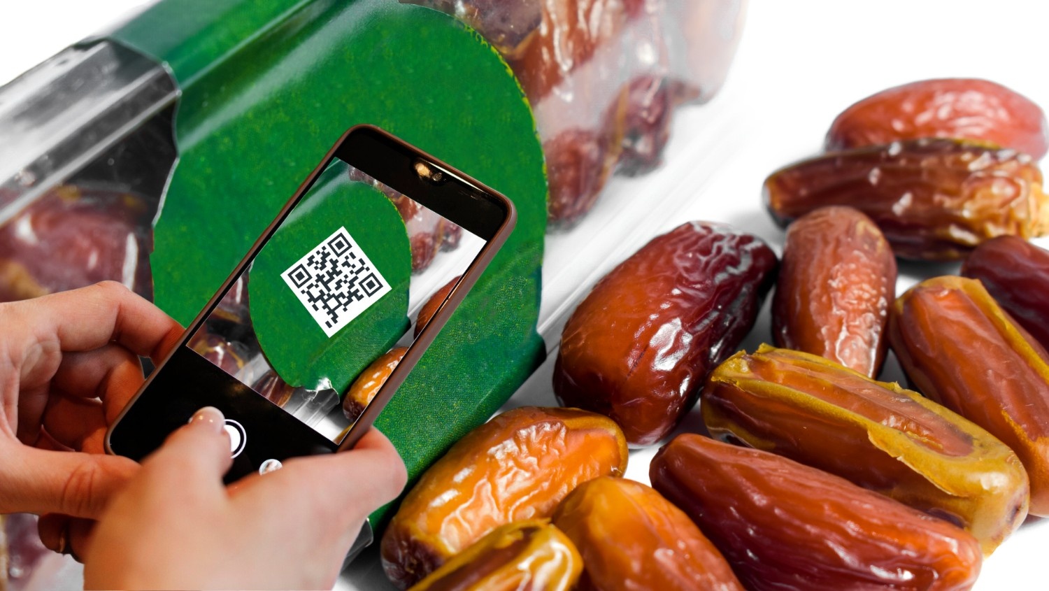 Verbraucher können den QR-Code scannen, um die vollständige Reise ihrer Datteln mit Echtzeitdaten, die überprüfbar sind, und einer erzählten Geschichte über Anbau, Ernte und Verarbeitung zu entdecken.